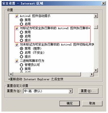 (2) IE安全级别。请在设置IE浏览器的安全级别:在 “工具->Internet选项->安全->自定义级别”查看“对标记为可安全执行脚本的ActiveX控件执行脚本”的选项,请选中“启用”选项。同时确保将“下载已签名的控件”设“启用”。(提示:跨文献库检索工具经过严格测试和并经过专业认证机构的签名,不会对你的系统造成影响。)
